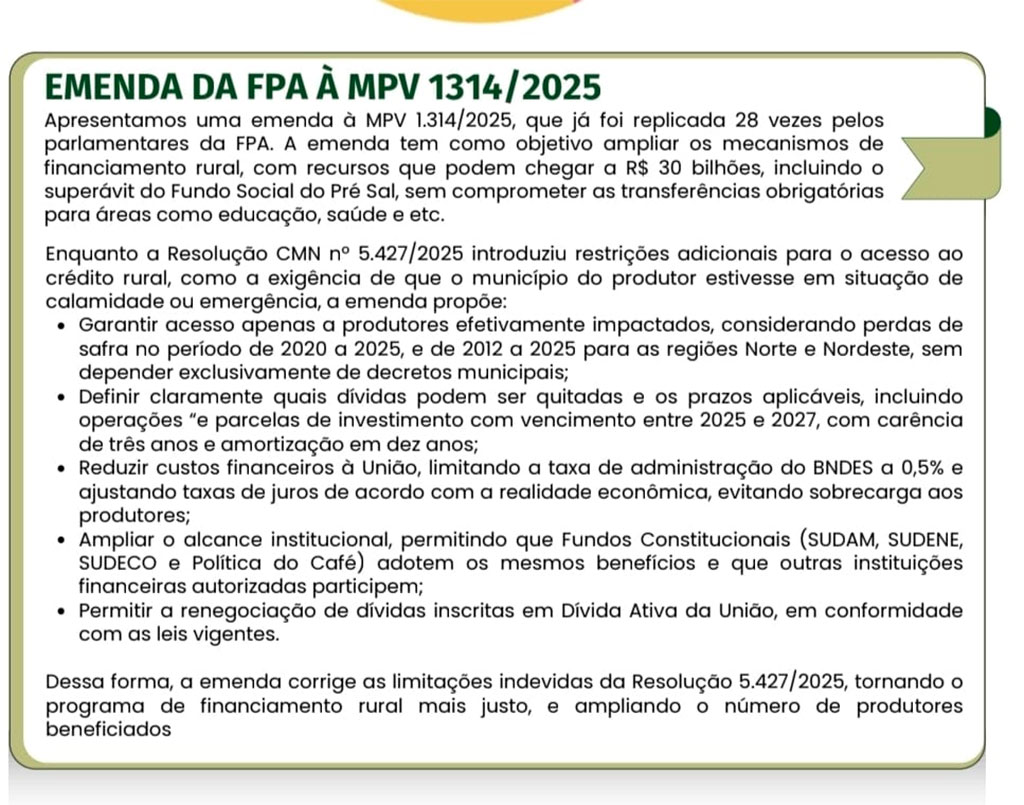 “É uma proposta que tem responsabilidade fiscal, mas também sensibilidade social. O crédito precisa ser um instrumento de justiça e não de exclusão. O agro é um dos setores que sustenta o Brasil e merece respeito nas decisões orçamentárias”, reforçou.